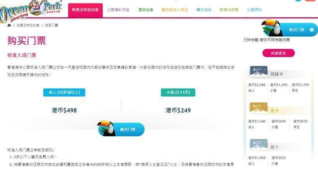 市界发现,香港海洋公园的普通门票分为两种,成人 (12岁或以上)为498港元一张,约合455元人民币,小童 (3-11岁)则为249港元一张,约合227人民币,而三岁以下儿童可以免费入场。