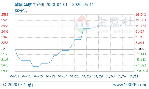醋酸:本周国内醋酸市场涨势延续,五一假期期间,河南供方装置因一氧化碳问题降负荷,市场现货供应稍有加紧,供方顺势推涨报盘,带动市场成交价格逐步走高,随后周边低端供方阶段性跟涨。华东主流厂家货源紧张,华中、山东现货厂家可售少量,市场现货流通数量有限,且部分贸易商与下游节后补货积极,推动醋酸市场节后阶段性小涨顺畅。。