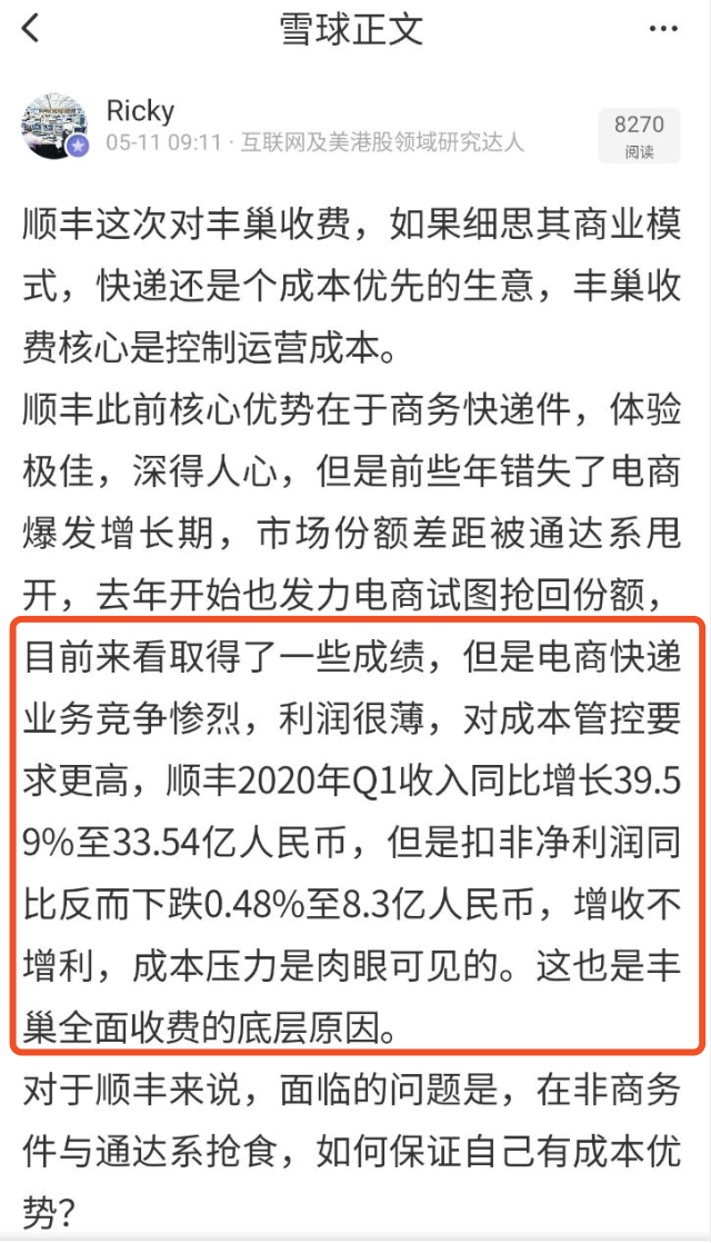 占据商务快递件核心优势的顺丰,从去年开始发力抢占电商份额,但是电商快递业务竞争惨烈,利润很薄,对成本管控要求更高,顺丰2020年Q1收入同比增长39.59%至33.54亿人民币,但是扣非净利润同比反而下跌0.48%至8.3亿人民币,增收不增利,成本压力是肉眼可见的。