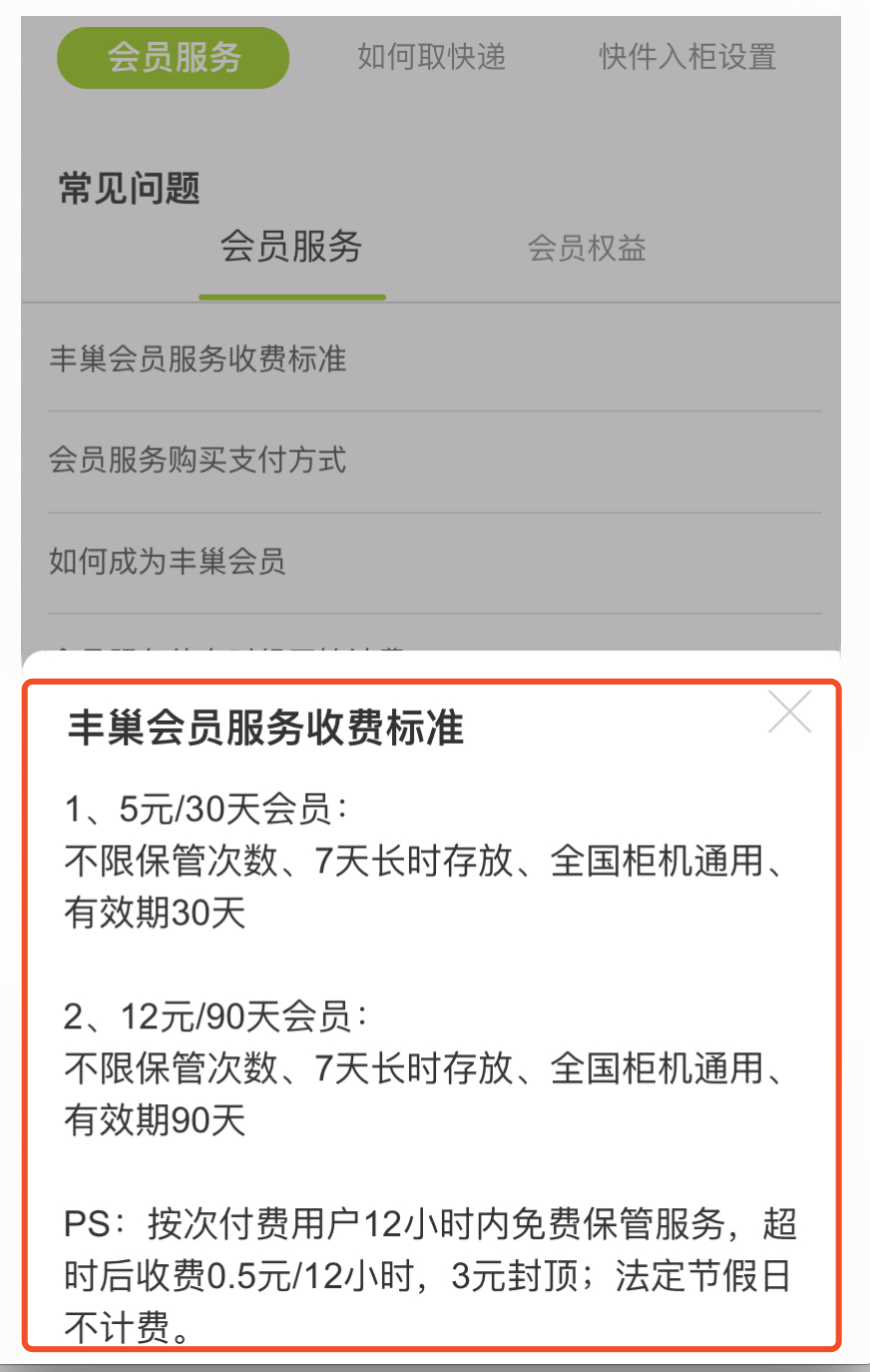 4月底,顺丰控股子公司丰巢智能柜宣布推出会员服务:普通用户可以免费保管用户包裹12小时,超时后每12小时收取0.5元,3元封顶。如不愿付费,可办理会员,月卡每月5元,季卡每季12元,不限保管次数,7天长时存放。