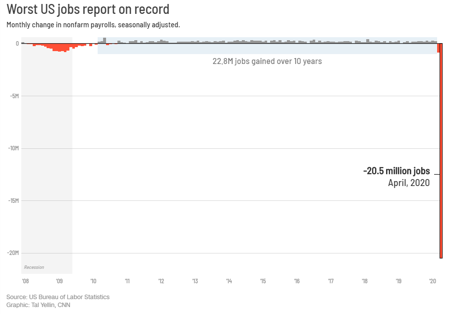 据美国媒体报道,美国4月份失业率已经飙升至14.7%,有2050万美国人失去工作岗位。美国劳工统计局表示,这是美国政府自1939年统计失业人数以来下跌幅度最集中一次。