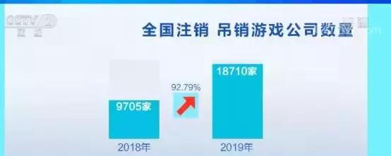2018年,全国注销、吊销的游戏公司数量仅为9705家;而到了2019年,这一数字达到18710家,近乎翻倍。