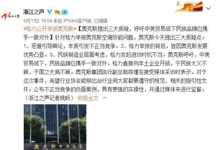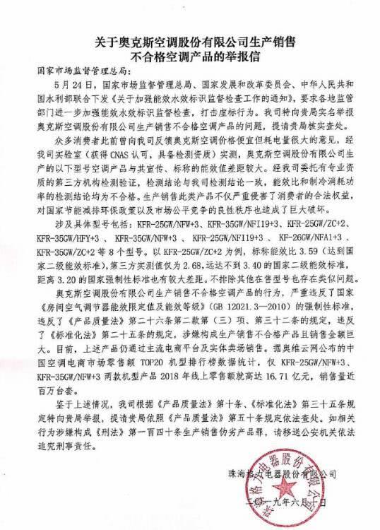 2019年6月10日,格力电器在其官方微博上发布了奥克斯生产销售不合格空调产品的举报信。