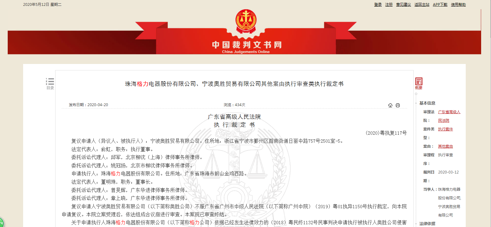 5月12日,中国裁判文书网资料显示,广东省高级人民法院宣布维持原判,认定宁波奥胜贸易有限公司(原宁波奥克斯空调有限公司)恶意侵权成立,判决后者向珠海格力电器股份有限公司赔偿4000万元。至此,历时3年多的格力诉奥克斯侵犯专利权一案尘埃落定。