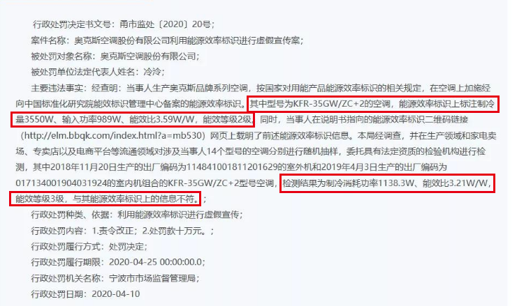 2020年4月10日,宁波市市场监督管理局公开了甬市监处〔2020〕20号行政处罚决定书,对奥克斯空调股份有限公司给出了罚款十万元并责令改正的处罚决定。