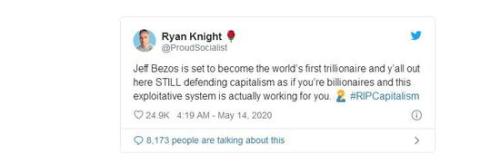 还有网友称:“杰夫·贝佐斯将成为世界上第一个亿万富翁,而你们都在这里继续捍卫资本主义,就好像你们都是亿万富翁,而这个剥削性的体系实际上正在为你们工作。”