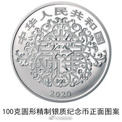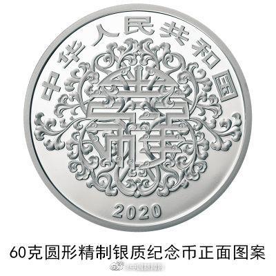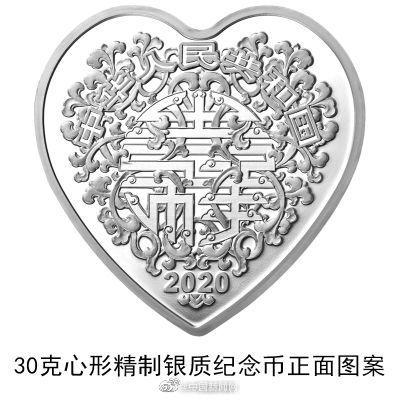中国人民银行定于2020年5月20日发行2020吉祥文化金银纪念币一套。该套纪念币共6枚,其中金质纪念币2枚,银质纪念币3枚,金银双金属纪念币1枚。其中心形纪念币背面图案包含为新娘、百合、窗棂等组合图案,并刊“百年好合”字样及面额。