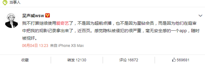 6月4日,爱奇艺《庆余年》超前点播案原告吴某在微博发文称:“我不打算继续使用爱奇艺了,不是因为超前点播,也不是因为星钻会员,而是因为他们在庭审中把我的观影记录拿出来了,上百页。感觉隐私被侵犯得很严重,毫无安全感的一个App,随时被视奸。”